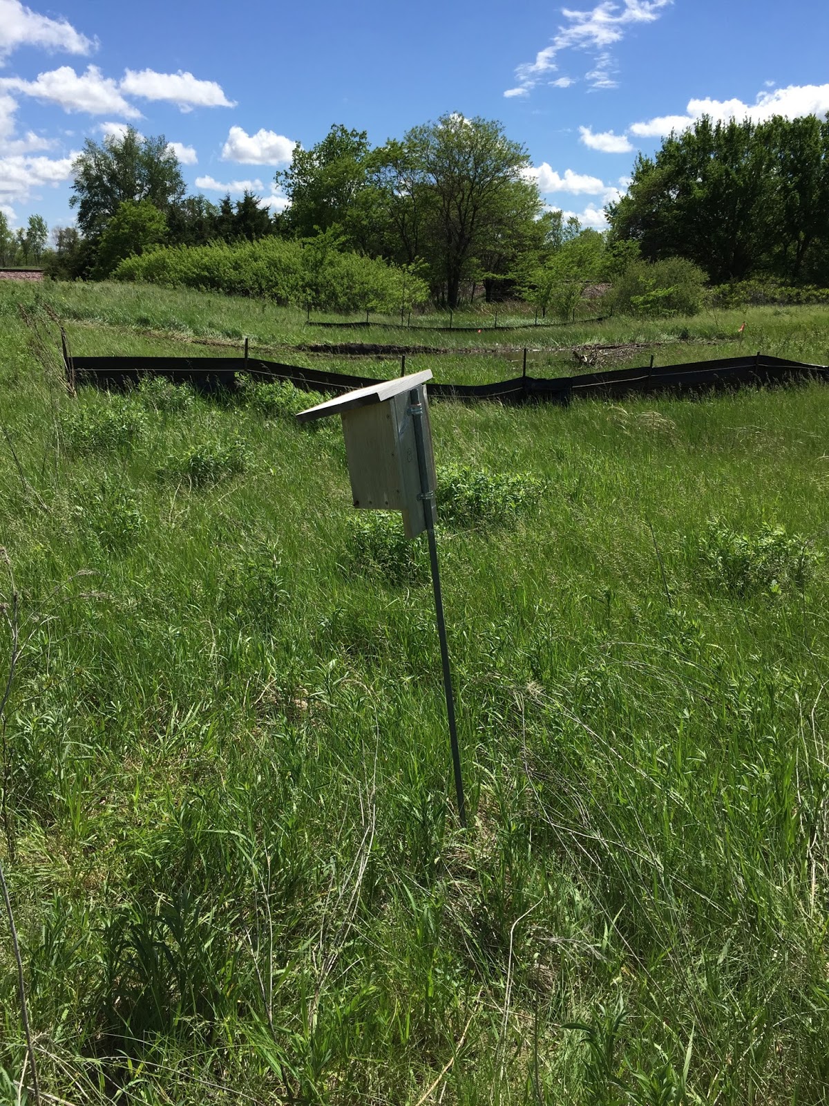 The box is in the prairie behind the nature center with the pond behind.