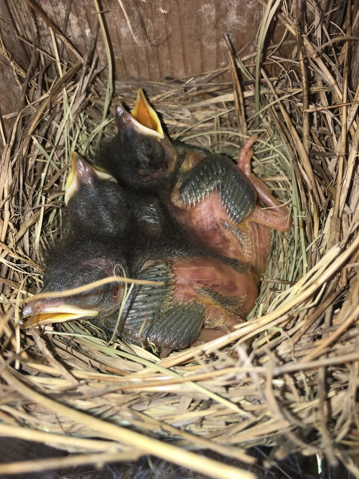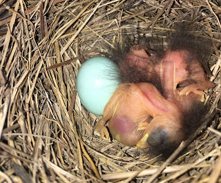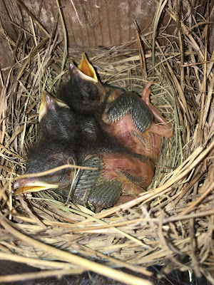 This was the confusion. I opened it twice, once getting a photo. Four tree swallows attacked me the whole time. I had to go home and check on photos of them. Are they bluebirds? Here they are earlier, one still an egg: